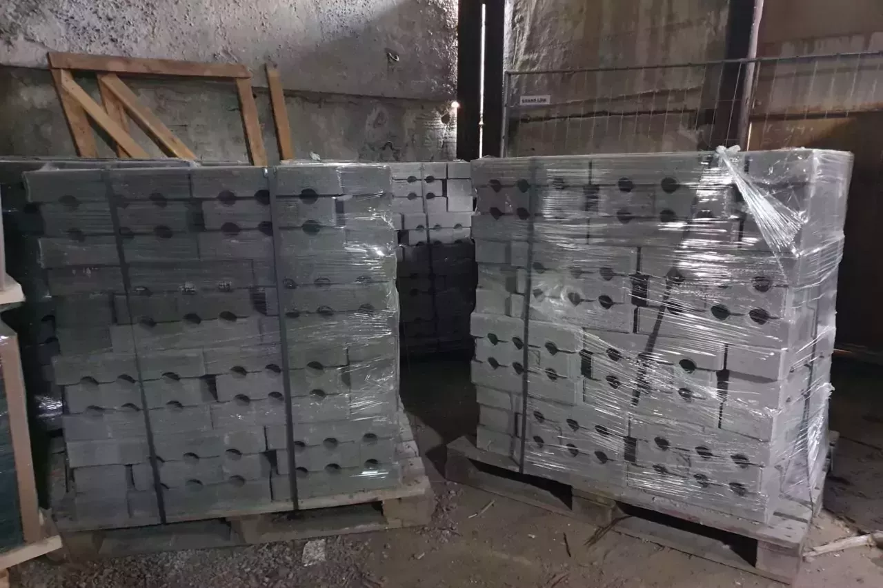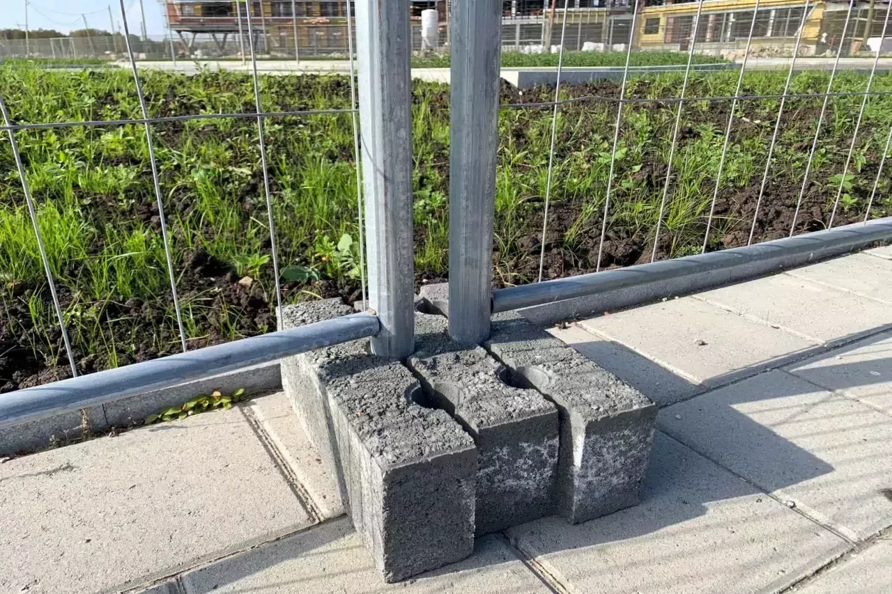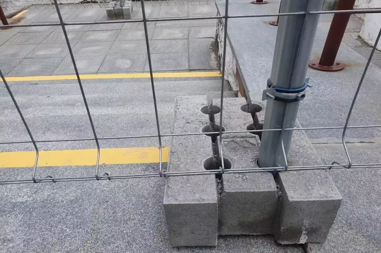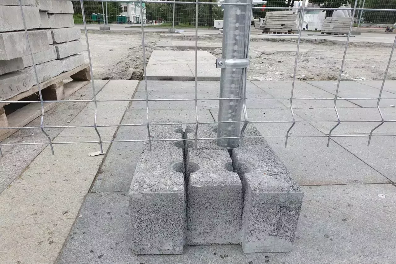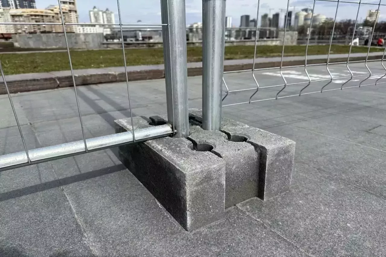 Бетонное основание имеет твердую и ровную поверхность с несколькими отверстиями для фиксации секций временного ограждения. Обеспечивает высокую устойчивость конструкций.
